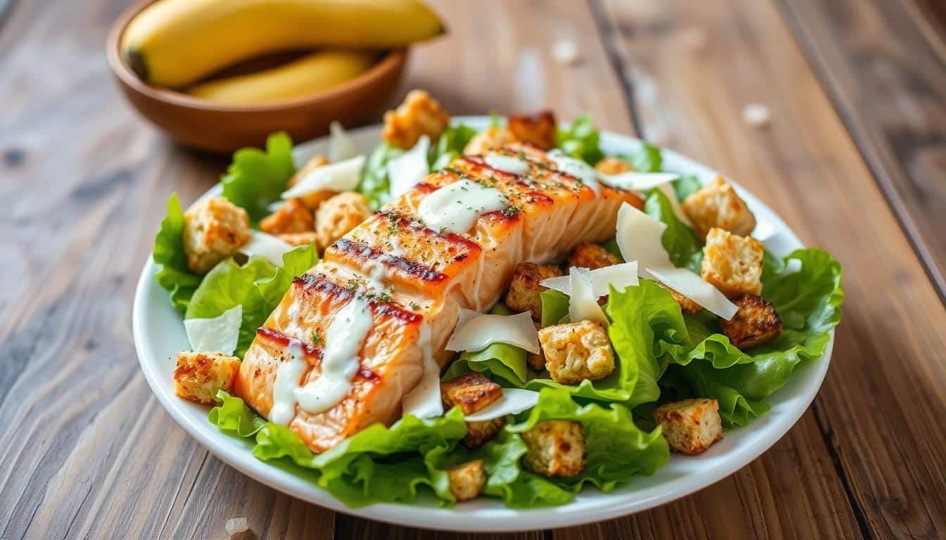 Salmon and Caesar salad together offer many health benefits. Salmon adds protein and omega-3s, while Caesar salad brings fresh veggies and a tangy dressing. This combo makes a healthy salmon salad that tastes great and is good for you.